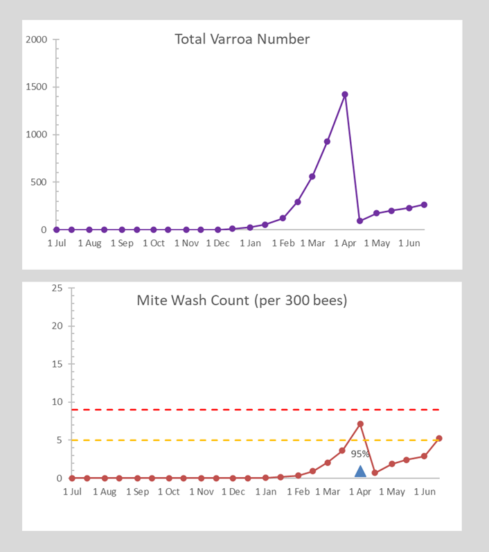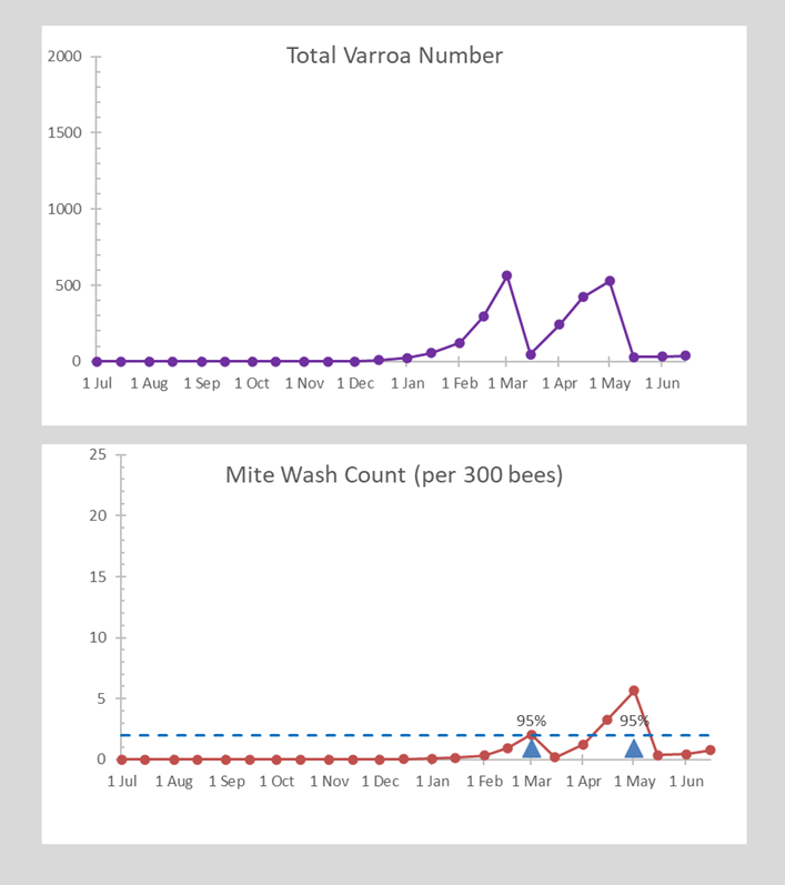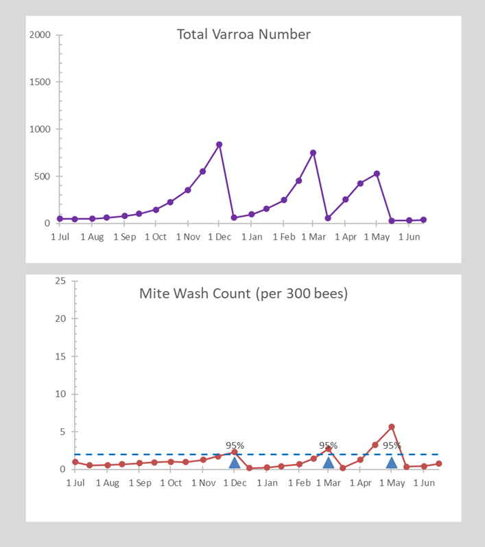 What if I use the lower treatment threshold of two mites in a wash? This time I needed to treat in March and repeated in May. It did require an extra treatment, but my mite load in winter was less than 50 (fig 3).