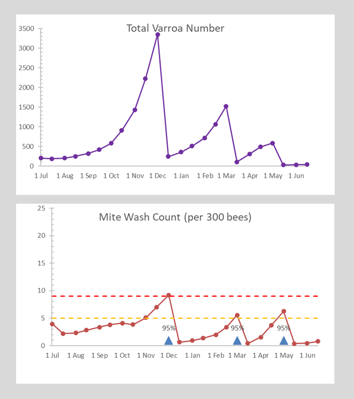 All of which suggests that the recommendation from Australia’s National Varroa Mite Management Plan to use treatment thresholds of 5 and 9 is very reasonable. But I’d like to challenge the thinking behind this. The concepts of integrated pest management and economic threshold have been handed down from agriculture in general. They are appropriate if you are growing cabbages. Spray with a pesticide and get more cabbages to sell. Balance the cost with the increased yield. But we are dealing with bees. We are interested not only in a harvest, but the year-to-year survival of our colonies. The more relevant metric is the number of treatments per year.